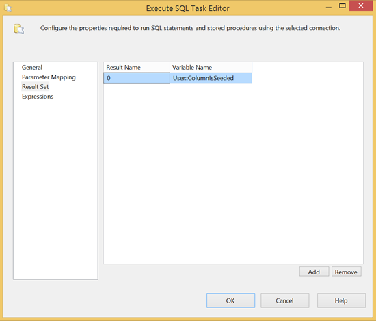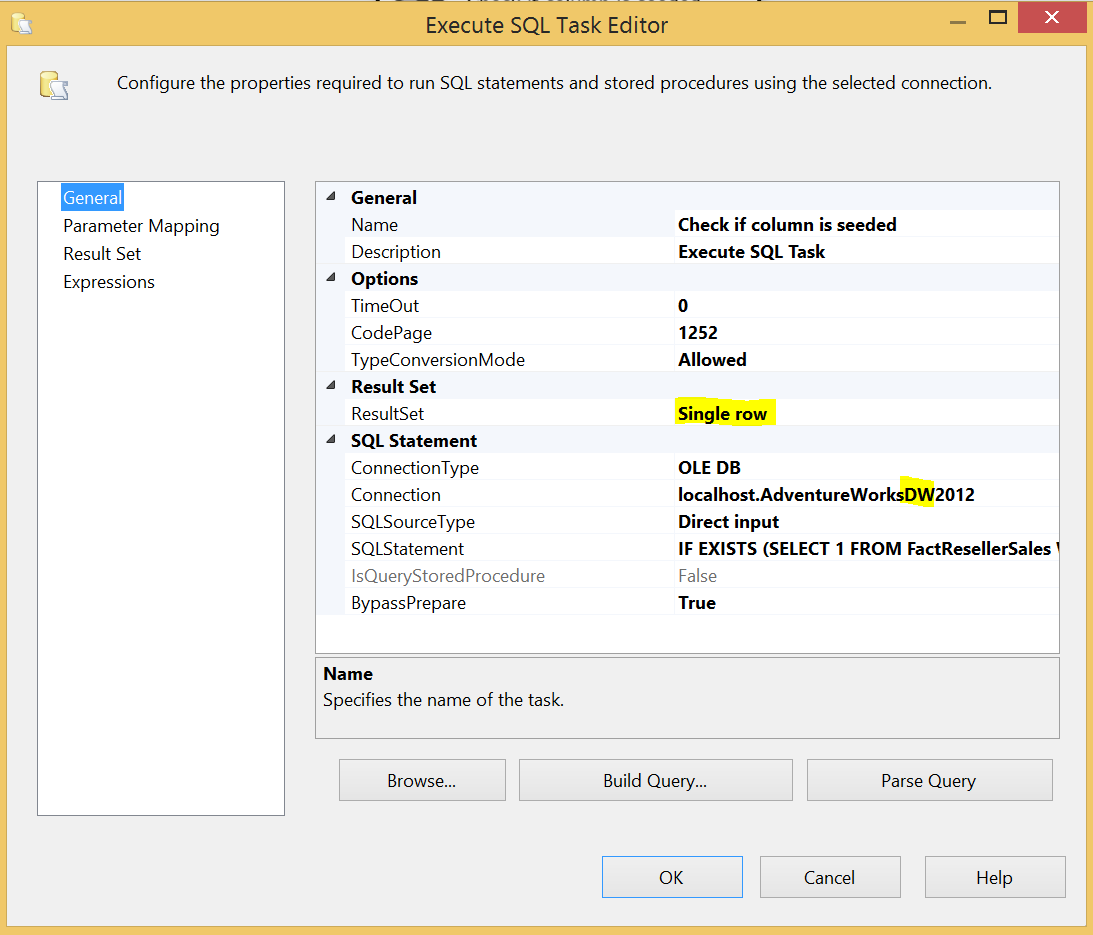 1234567891011IF EXISTS (SELECT1FROM FactResellerSalesWHERE PaymentTypeKey <> '-1')SELECT1 AS ColumnIsPopulatedELSESELECT0 AS ColumnIsPopulatedThis gives you a Boolean value which you can assign to a package variable on which you can direct the flow of the package. The result set is set up as follows: