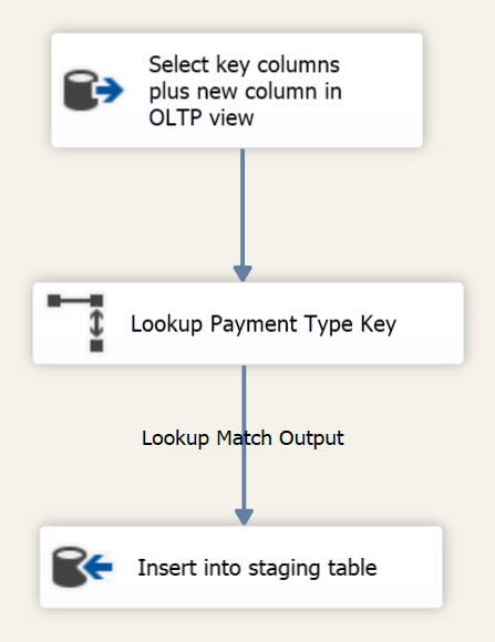 - Alter your view on the OLTP database or change the query in the OLE DB Source of your original SSIS dataflow to include the ID of reference table (in our case PaymentTypeID)