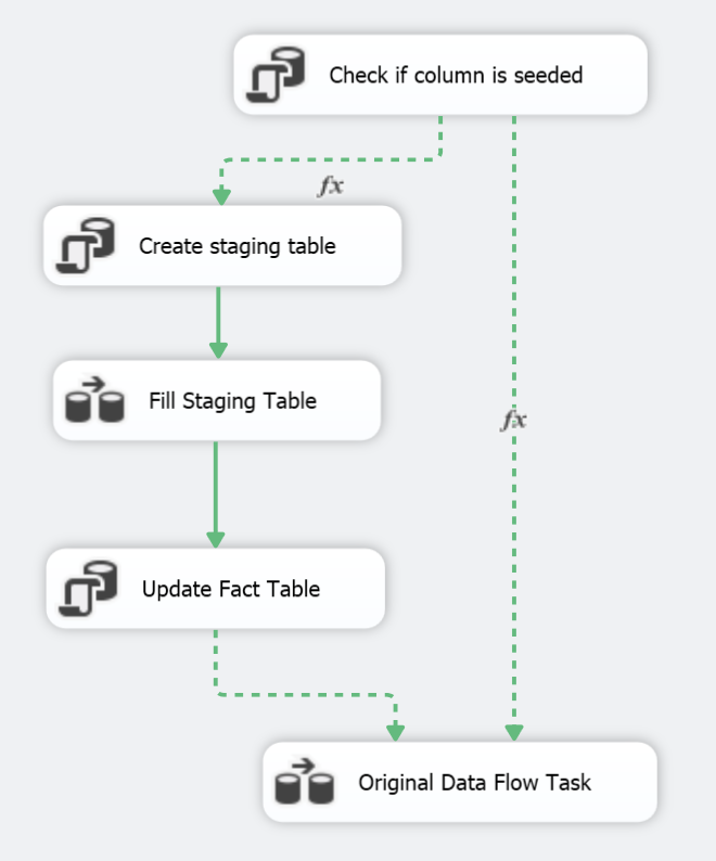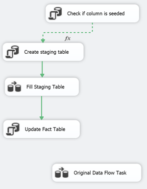 This solution provides a way of safely updating a new column that has been added to an existing fact table. The conditional check allows the flow of the package to update column where there is existing data or just move to the old data flow task if the data has already been populated. With that in mind, the new branch of data flow will logically only run once. Once you have successfully run the ETL you can delete or disable the steps and just run the “Original Data Flow Task” as you did before.