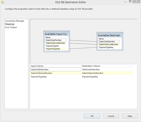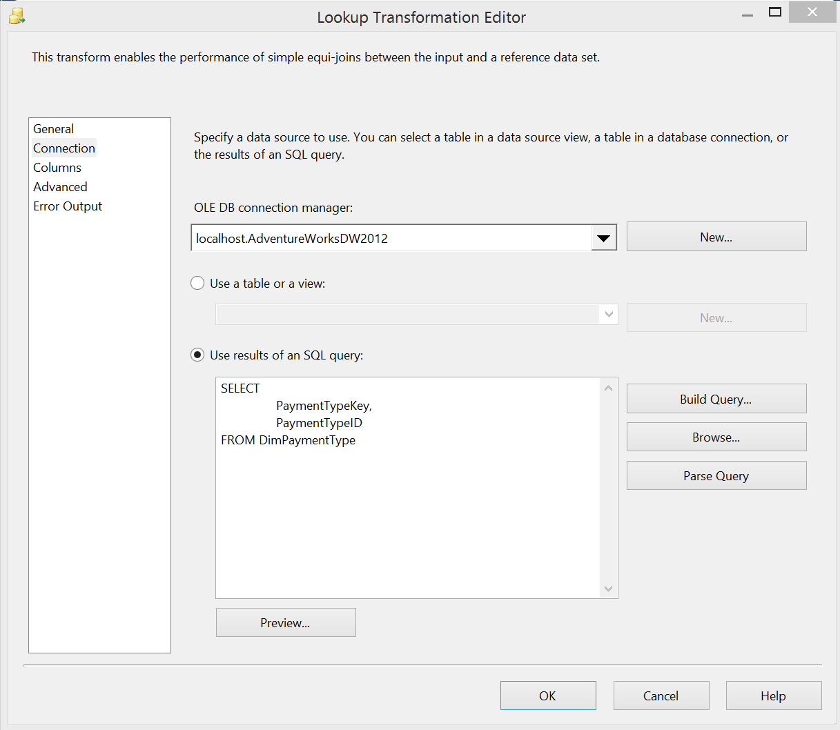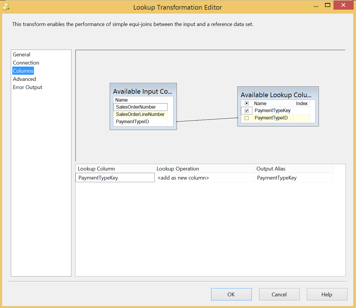 12345678SELECTSalesOrderNumber,SalesOrderLineNumber,PaymentTypeIDFROM ViewFactResellerSalesWHERE PaymentTypeID IS NOT NULLThe lookup task find the PaymentTypeKey from the PaymentTypeID (these are not always the same as surrogate keys are often preferred in denormalized data warehouses). The Lookup task is setup to select the PaymentTypeKey and PaymentTypeID from DimPaymentType in the “Connection” screen and join on PaymentTypeID on the “Columns” screen as follows: