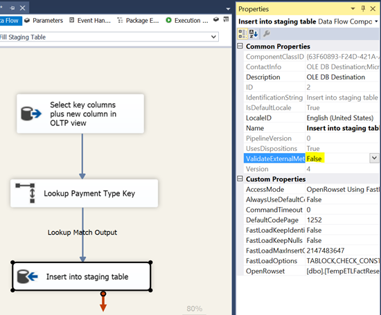 N.B. You must first run the CREATE script of the temporary staging table to be able to set up this mapping in the UI. Also, in order to run the package it is important to change the “ValidateExternalMetadata” value of the OLE DB Source task to “False”. This allows the package to run even when the table does not yet exists (this is normal as it is created in the previous step)