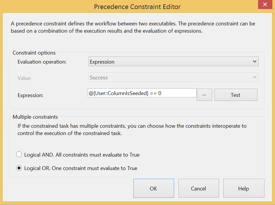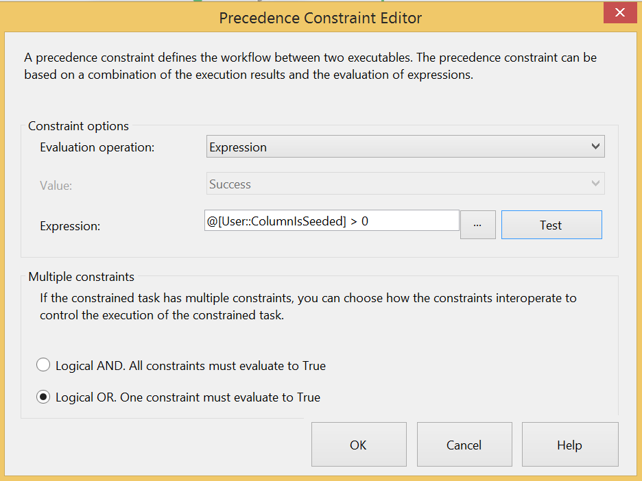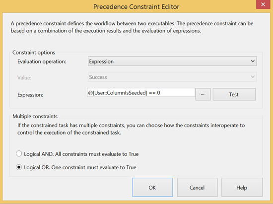 Once you are done, drag in another Execute SQL task that will be used for the creation of the staging table. However before you start that, drag an output to the new task and double click on the arrow to open its properties. From here you can change the “Evaluation operation” from “Constraint” to “Expression” and use the following expression (don’t forget to change the “Multiple constraints” value to a “Logical OR” which implies the ETL will take either this output or the other):