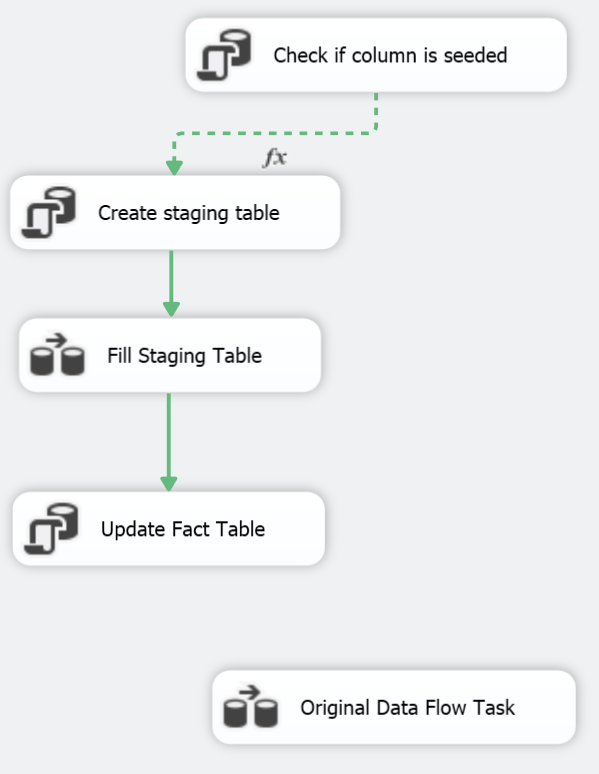 To do so, drag the output of the “Update Fact Table” task to the “Original Data Flow Task”.