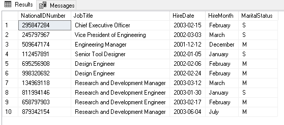 SELECT top 10 [NationalIDNumber] ,[JobTitle] ,[HireDate] ,[MaritalStatus] FROM [AdventureWorks].[HumanResources].[Employee] |