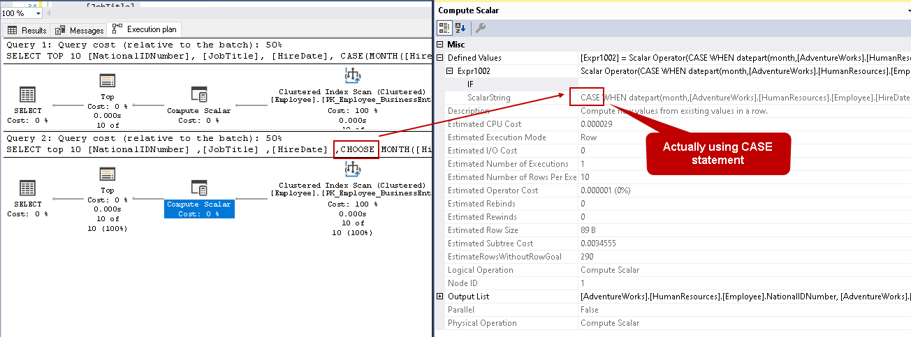 The Choose() function is a shorthand of the Case statement. You can write smaller t-SQL codes to do similar using choose() function in comparison with the Case statement. We can see this difference in the SQL queries used for Case statement and SQL Choose(). You can also compare the other parameters in these plans, and all parameter looks similar.