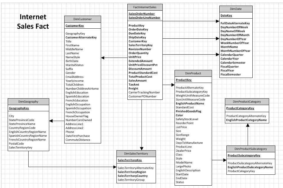 Figure 2 shows a business database diagram of the full Adventure Works DW with just the fact table for Internet Sales.