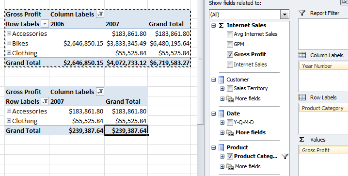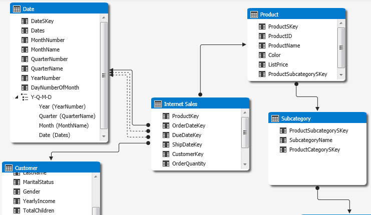 But, in other cases, like Sales Territory, there is a different table between the territories and the fact table. The Reseller Sales needs to go through Reseller dimension while the Internet Sales needs to go through the Customer dimension. Both use the Geography dimension to get the country with links to the Sales Territory dimension.