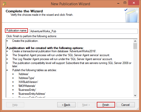 The publication setup progress appears. It summarizes the progress of the publication setup and configuration. In case of this tutorial, you would see that the Adventureworks_Pub is successfully created. The wizard will take care of creating the publication, adding the articles, and then starting the snapshot agent to take that initial snapshot of the AdventureWorks2016 database