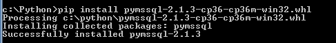cd c:\Python pip install pymssql-2.1.3-cp36-cp36m-win32.whl |