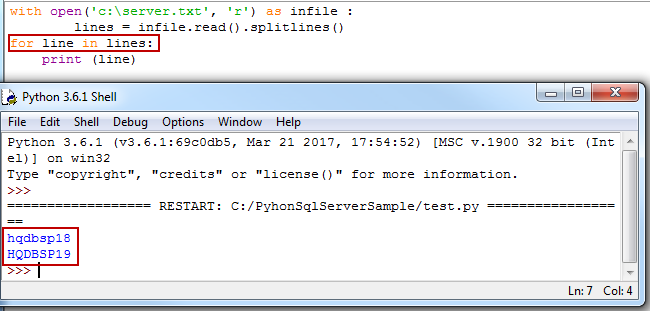 with open('c:\server.txt', 'r') as infile : lines = infile.read().splitlines() for line in lines: print (line) |