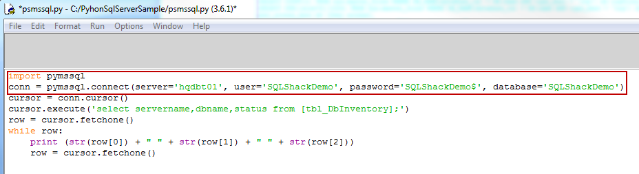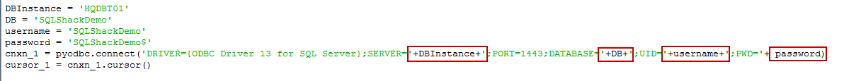 123456789DBInstance = 'HQDBT01'DB = 'SQLShackDemo'username = 'SQLShackDemo'password = 'SQLShackDemo$'cnxn_1 = pyodbc.connect('DRIVER={ODBC Driver 13 for SQLServer};SERVER='+DBInstance+';PORT=1443;DATABASE='+DB+';UID='+username+';PWD='+password)