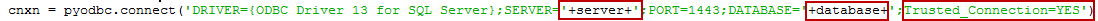 1234cnxn = pyodbc.connect('DRIVER={ODBC Driver 13 for SQLServer};SERVER='+server+';PORT=1443;DATABASE='+database+';Trusted_Connection=YES')