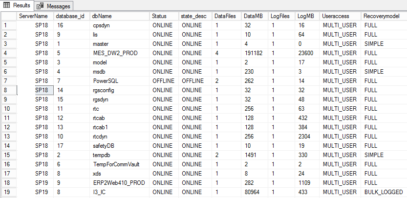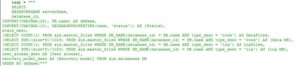 tsql = """ SELECT @@SERVERNAME serverName, database_id, CONVERT(VARCHAR(25), DB.name) AS dbName, CONVERT(VARCHAR(10), DATABASEPROPERTYEX(name, 'status')) AS [Status], state_desc, (SELECT COUNT(1) FROM sys.master_files WHERE DB_NAME(database_id) = DB.name AND type_desc = 'rows') AS DataFiles, (SELECT SUM((size*8)/1024) FROM sys.master_files WHERE DB_NAME(database_id) = DB.name AND type_desc = 'rows') AS [Data MB], (SELECT COUNT(1) FROM sys.master_files WHERE DB_NAME(database_id) = DB.name AND type_desc = 'log') AS LogFiles, (SELECT SUM((size*8)/1024) FROM sys.master_files WHERE DB_NAME(database_id) = DB.name AND type_desc = 'log') AS [Log MB], user_access_desc AS [User access], recovery_model_desc AS [Recovery model] FROM sys.databases DB ORDER BY dbName;""" |