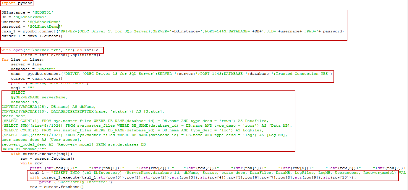import pyodbc DBInstance = 'HQDBT01' DB = 'SQLShackDemo' username = 'SQLShackDemo' password = 'SQLShackDemo$' cnxn_1 = pyodbc.connect('DRIVER={ODBC Driver 13 for SQL Server};SERVER='+DBInstance+';PORT=1443;DATABASE='+DB+';UID='+username+';PWD='+ password) cursor_1 = cnxn_1.cursor() with open('c:\server.txt', 'r') as infile : lines = infile.read().splitlines() for line in lines: server = line database = 'Master' cnxn = pyodbc.connect('DRIVER={ODBC Driver 13 for SQL Server};SERVER='+server+';PORT=1443;DATABASE='+database+';Trusted_Connection=YES') cursor = cnxn.cursor() print ('Reading data from table') tsql = """ SELECT @@SERVERNAME serverName, database_id, CONVERT(VARCHAR(25), DB.name) AS dbName, CONVERT(VARCHAR(10), DATABASEPROPERTYEX(name, 'status')) AS [Status], state_desc, (SELECT COUNT(1) FROM sys.master_files WHERE DB_NAME(database_id) = DB.name AND type_desc = 'rows') AS DataFiles, (SELECT SUM((size*8)/1024) FROM sys.master_files WHERE DB_NAME(database_id) = DB.name AND type_desc = 'rows') AS [Data MB], (SELECT COUNT(1) FROM sys.master_files WHERE DB_NAME(database_id) = DB.name AND type_desc = 'log') AS LogFiles, (SELECT SUM((size*8)/1024) FROM sys.master_files WHERE DB_NAME(database_id) = DB.name AND type_desc = 'log') AS [Log MB], user_access_desc AS [User access], recovery_model_desc AS [Recovery model] FROM sys.databases DB ORDER BY dbName;""" with cursor.execute(tsql): row = cursor.fetchone() while row: print (str(row[0])+" "+str(row[1])+" "+str(row[2])+ " "+str(row[3])+" "+str(row[4])+" "+str(row[5])+" "+str(row[6])+" "+str(row[7])+" "+str(row[8])+" "+str(row[9])+" "+str(row[10])) tsql_1 = "INSERT INTO [tbl_DbInventory] (ServerName,database_id, dbName, Status, state_desc, DataFiles, DataMB, LogFiles, LogMB, Useraccess, Recoverymodel) VALUES (?,?,?,?,?,?,?,?,?,?,?);" with cursor_1.execute(tsql_1,str(row[0]),row[1],str(row[2]),str(row[3]),str(row[4]),row[5],row[6],row[7],row[8],str(row[9]),str(row[10])): print ('Successfuly Inserted!') row = cursor.fetchone() |