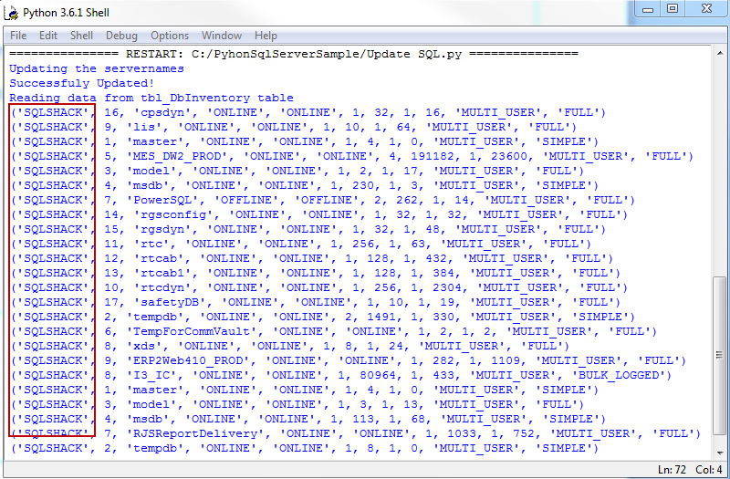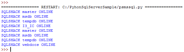 import pymssql conn = pymssql.connect(server='hqdbt01', user='SQLShackDemo', password='SQLShackDemo$', database='SQLShackDemo') cursor = conn.cursor() cursor.execute('select servername,dbname,status from [tbl_DbInventory];') row = cursor.fetchone() while row: print (str(row[0]) + " " + str(row[1]) + " " + str(row[2])) row = cursor.fetchone() |