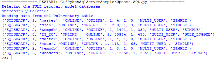 import pyodbc server = 'HQDBT01' database = 'SQLShackDemo' username = 'SQLShackDemo' password = 'SQLShackDemo$' cnxn = pyodbc.connect('DRIVER={ODBC Driver 13 for SQL Server};SERVER='+server+';PORT=1443;DATABASE='+database+';UID='+username+';PWD='+ password) cursor = cnxn.cursor() #Delete Query print ('Deleting the FULL recovery model databases ') tsql = "DELETE FROM tbl_DbInventory WHERE [Recoverymodel] = ?" with cursor.execute(tsql,'FULL'): print ('Successfuly Deleted!') #Select Query print ('Reading data from tbl_DbInventory table') tsql = "SELECT * FROM tbl_DbInventory;" cur=cursor.execute(tsql) for row in cur: print(row) |
