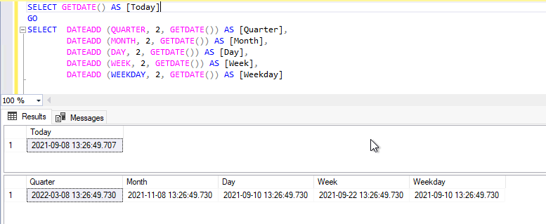 Note, I have fetched the current date-time output using the SQL Server GETDATE function for noting what is today’s date and time. All calculations will happen from this value. You can pass any number to this query and output will return the nth value of that portion of date-time. If you want to get similar output from the past then you need to pass this number with negative signs like -2, -5, etc.