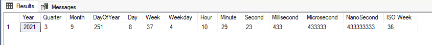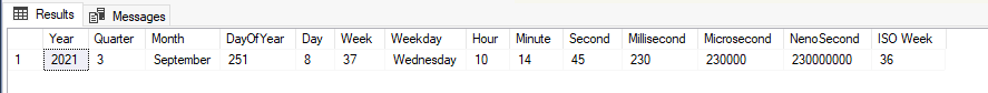 Below is the output of the above query in which we can see all result sets have returned their value in integer datatype whereas results returned using the DATENAME function was in character strings.