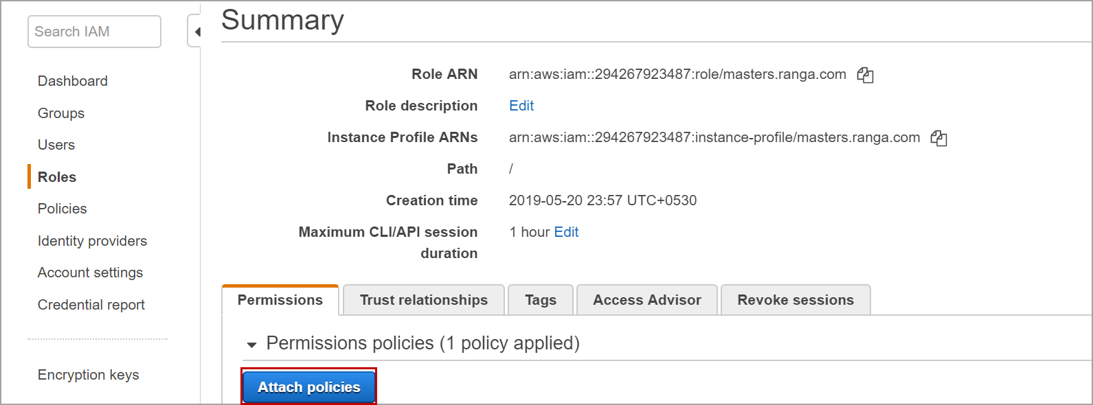 Before deploying the SQL Server in K8s cluster created in AWS using KOPS, we need to give permissions to create a load balancer for the role which is attached to the master node in the cluster. Navigate to IAM console and click on the role associated with the master node. In my case it is masters.ranga.com. Click on Attach policies.