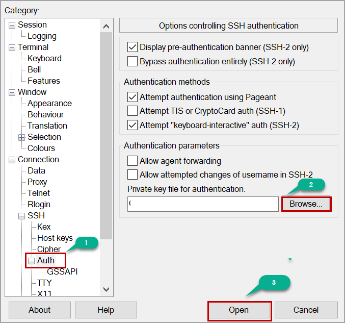 Click on Auth (1). Browse the private key you created in the above step (2). Click on Open (3).
