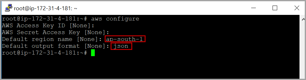 Configure AWS CLI using below command. Leave the access key id and secret key blank as we are using the IAM role that is attached to the Ubuntu EC2 instance. Input the default region of your choice and output format like JSON.