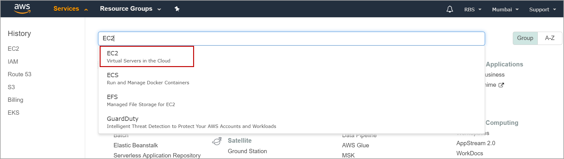 Log in to the AWS console, Click on Services and search for EC2. Click on EC2(Virtual Servers in the Cloud).