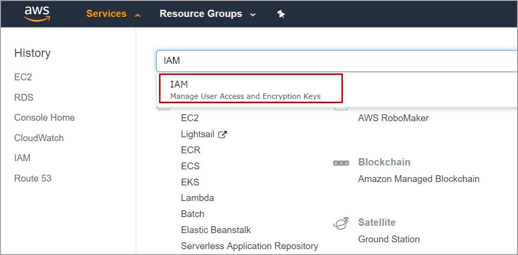 To create an IAM role, click on Services and search for IAM. Click on IAM (Manage User Access and Encrypted Keys)