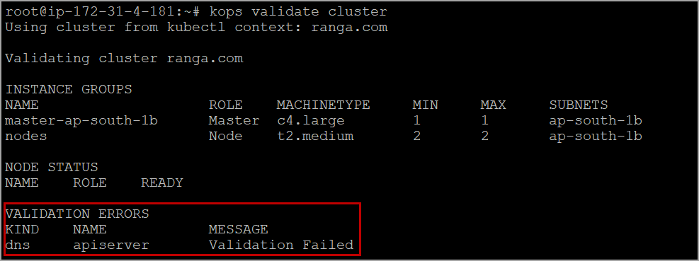 Create the cluster by executing below command. This will create the cluster in the zone “ap-south-1b” with cluster name as “ranga.com”.