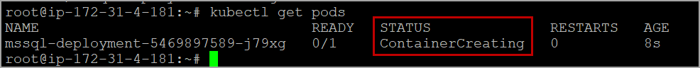 Once you execute the above command, it will create a deployment with name mssql-deployment in Kubernetes cluster. Now a pod is created with SQL Server running in it. Execute the below command to get the status of the pod.