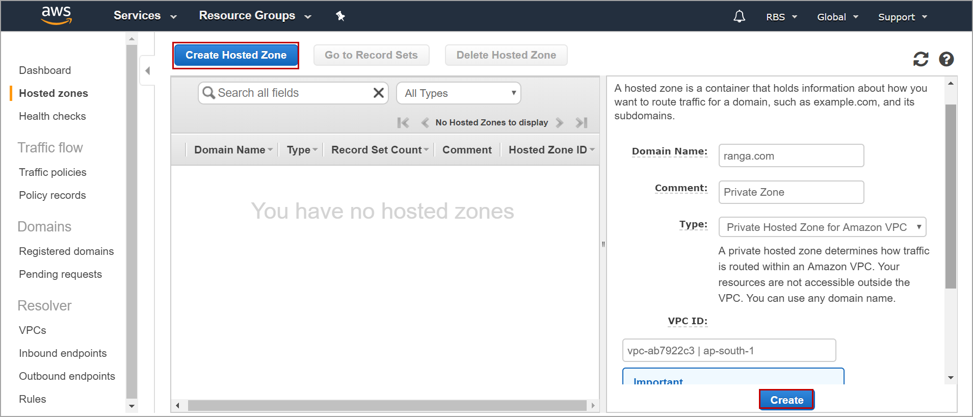Click on Create Hosted Zone. enter the domain name and select Private Hosted Zone for Amazon VPC as type.