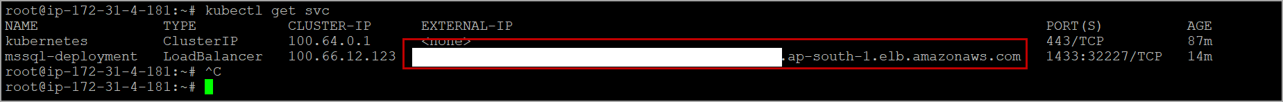 To know the public IP of the SQL Server, execute below command. This command will list all the available services in the Kubernetes cluster with the service name, internal IP and external IP.