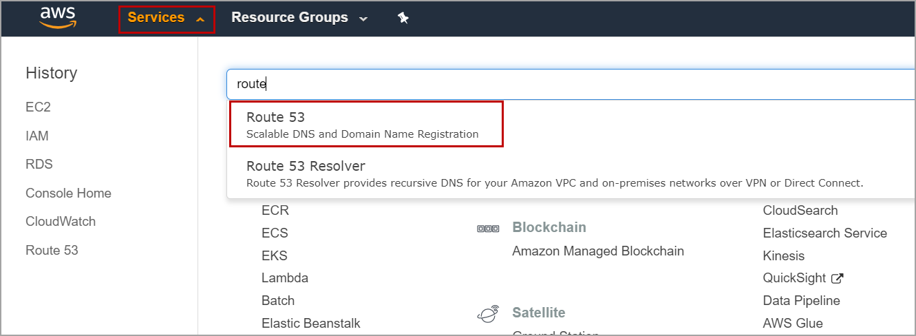 Now, create a private hosted zone in Route53. To create a hosted zone, click on Services and search for Route 53. Select Route 53 (scalable DNS and Domain Registration)