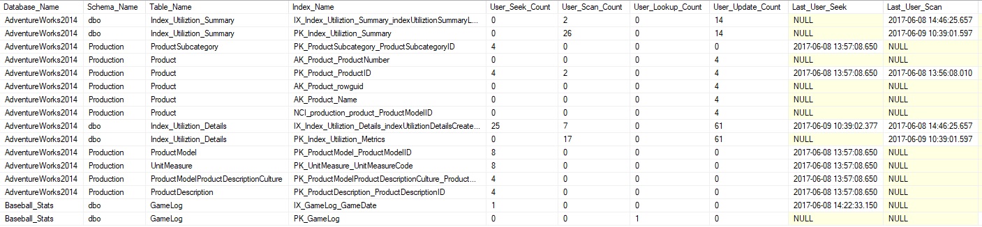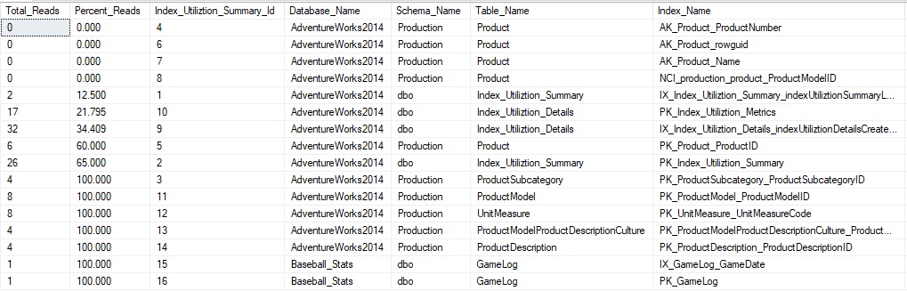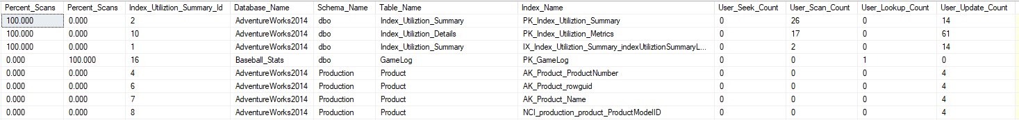 This stored procedure will iterate through all non-system databases, read from dm_db_index_usage_stats, join that data to other system views, and report it back to our permanent tables that were created above. This process is quite fast, as the volume of data we are looking at is bounded by the number of indexes you have. If only a single database or set of databases matters to you, then filtering can be performed in order to limit the database list to those of interest.
