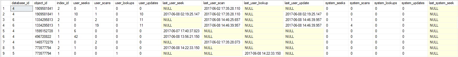 Totals are given for seeks, scans, lookups, and updates, which allows us to accurately gauge the overall read/write operations against any given index. We also can see the last time an index had those operations performed against them, where NULL indicates that none have happened since the last instance restart.