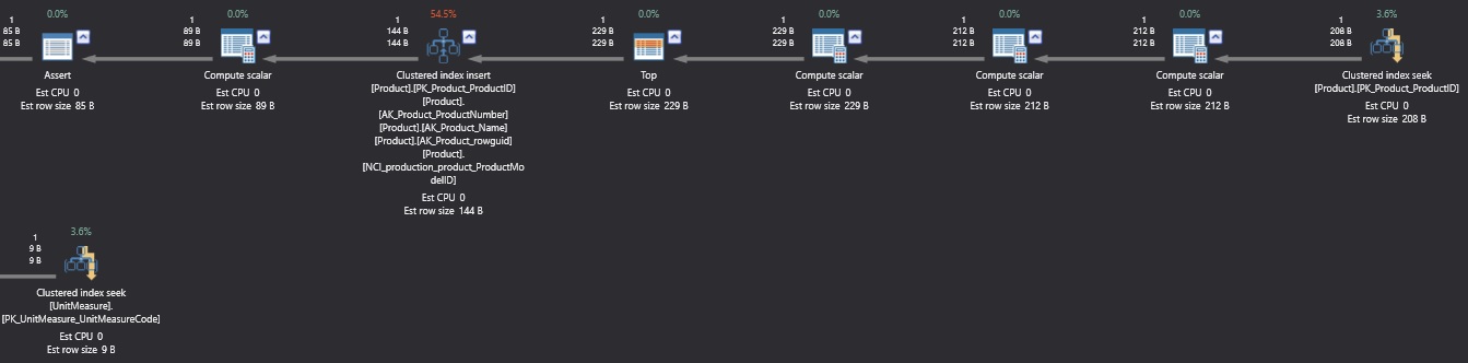While indexes can improve query execution speed, the price we pay is on index maintenance. Update and insert operations need to update the index with new data whenever columns in the index are included. This means that writes will slow down slightly with each index we add to a table. For example, if we were to insert a row into Production.Product (in AdventureWorks), the resulting execution plan for the insert would look like this: