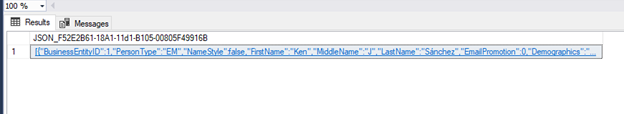 SELECT TOP 1 [BusinessEntityID] ,[PersonType] ,[NameStyle] ,[Title] ,[FirstName] ,[MiddleName] ,[LastName] ,[Suffix] ,[EmailPromotion] ,[AdditionalContactInfo] ,[Demographics] ,[rowguid] ,[ModifiedDate] FROM [AdventureWorks2017].[Person].[Person] FOR JSON AUTO |