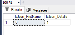 SELECT TOP 1 ISJSON([FirstName]) IsJson_FirstName,ISJSON([Details]) IsJson_Details FROM [AdventureWorks2017].[Person].[Person] |