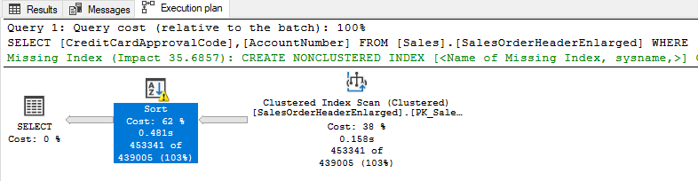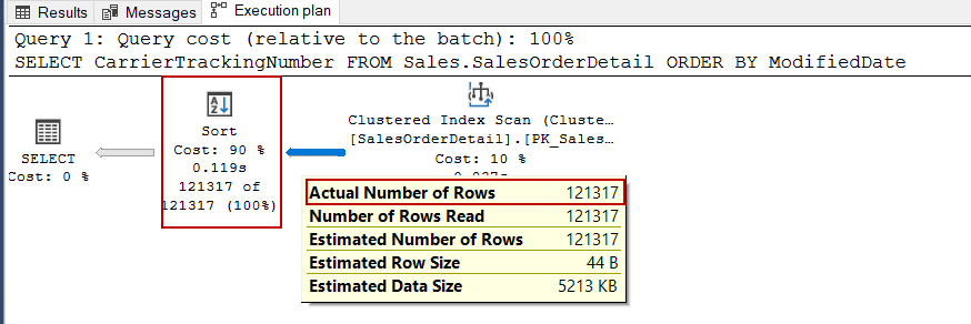 When we check the query plan after the execution of the query, we will see that the storage engine reads the data by way of the clustered index scan operator. As a second step, the sort operator takes 121.317 rows as input and sorts them in ascending order.