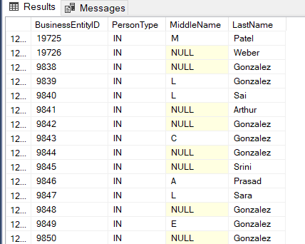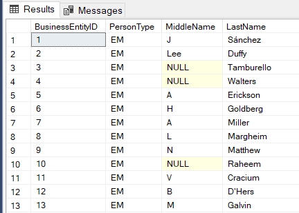 SELECT BusinessEntityID, PersonType, MiddleName, LastName FROM Person.Person |