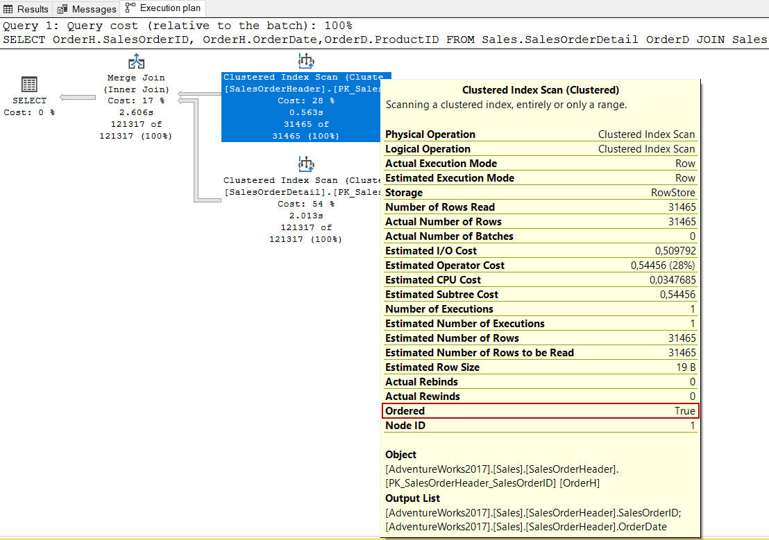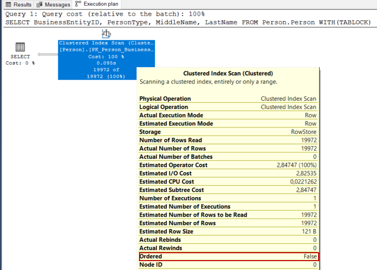 In the execution plan, we see an Ordered attribute of the clustered index scan operator as true. With the help of this attribute, we can understand that the storage engine has returned the data rows in a sorted manner.