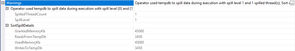 In the execution plan, we see a warning sign on the sort operator which means that the memory grant is not enough for the sort operation and the query required more memory to perform the sort operation. In this circumstance, during the execution of the query, the sort operator uses the tempdb database to meet the memory deficit. When we analyze the sort operator properties, we can find out more detailed information about the tempdb spill issue.