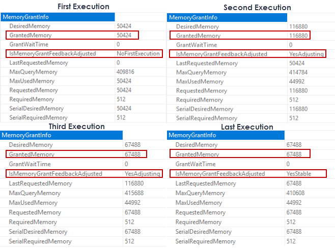 - Tip: Row Mode Memory Grant Feedback feature in SQL Server 2019 helps to overcome this problem without any code changing. The main idea of this feature is to adjust the memory grant requirement of a query to use the last execution memory grant information. With the help of this feature, we can assume that several executions of the query the memory grant must be adjusted. The below image illustrates memory grant changings after the four execution of the query. In the last execution of the query, the optimizer has decided to find the proper memory grant amount for this query