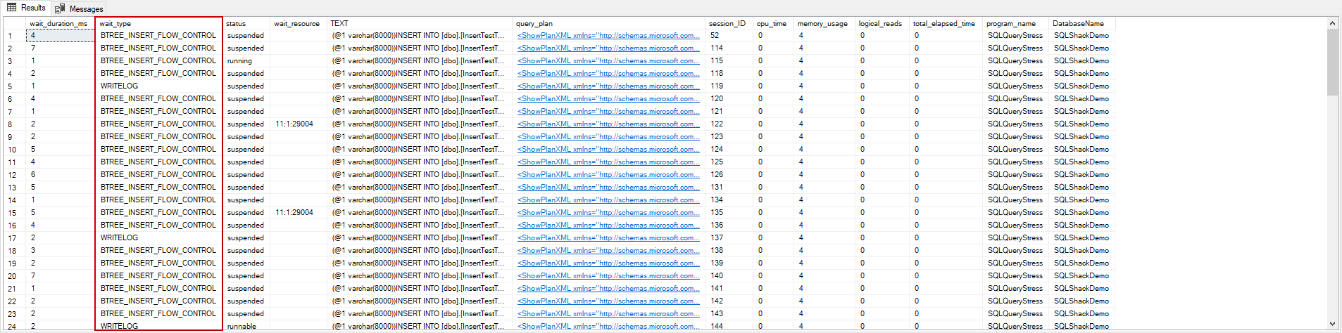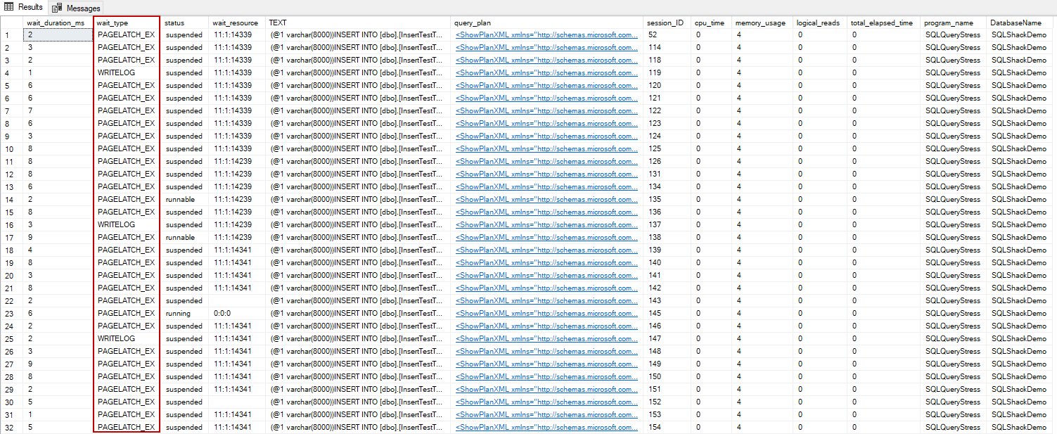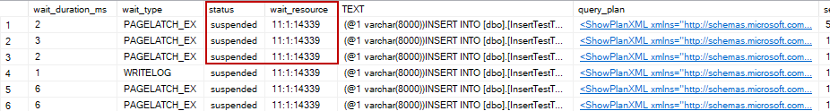 The above image illustrates that the session status is suspended for various rows and their wait types are PAGELATCH_EX. This situation means that they are waiting for a particular page that is not accessible at that time.