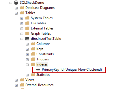 The main difference between the clustered index and non-clustered index in SQL Server is that the clustered index creates a sorted structure of the table. On the other hand, the heap tables do not contain any clustered index therefore the insert operations are not enforcing a strict order, so the insert operation is faster. To resolve the last page insert problem and reduce the PAGELATCH_EX wait type we can take advantage of this design approach so it improves SQL Server performance. At first, we will drop the clustered index and primary key on the InsertTestTable.