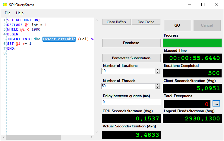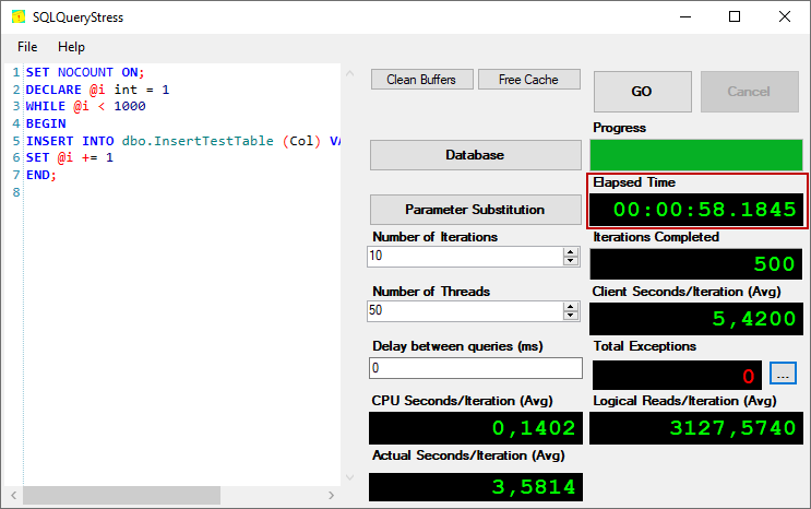 After enabling the OPTIMIZE_FOR_SEQUENTIAL_KEY feature, we will run SQLQueryStress with the same query and with same settings.