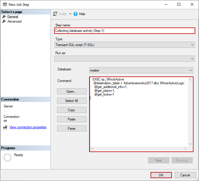 At the same time, WhoisActive allows us to insert its result set into a table. To enable this feature of the WhoisActive, we will execute the following script and it will create a table that is needed to store the data.
