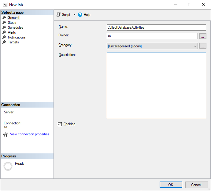 After the table creation, we need a job to collect data automatically and on a scheduled basis. At first, we open up a new SQL Server Agent Job and give a name to it.