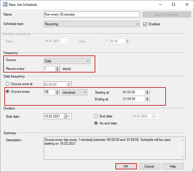 As the last step, we navigate the Schedules menu and schedule the job to run every 30 minutes.