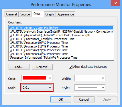 Reading the Page Faults/sec values when the default line scale is used is not possible