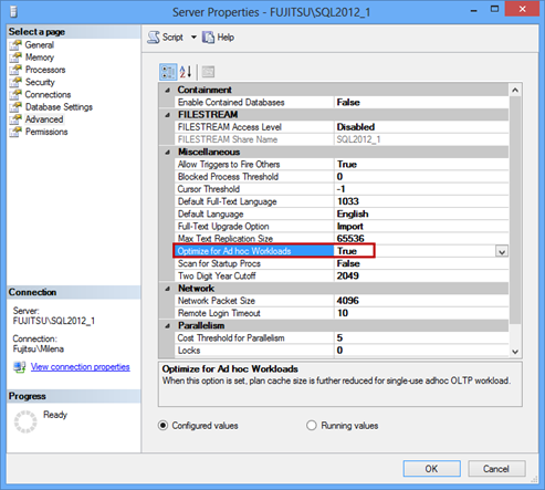 In the Miscellaneous options list, set the Optimize for ad hoc workloads option to True